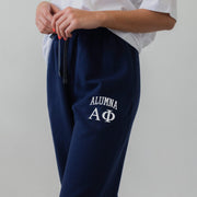 Navy joggers, white embroidery. 100% Cotton. Our model is wearing size medium (unisex).