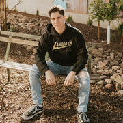 Black hoodie, boyfriend fit. 50% Cotton, 50% Polyester. Our models are wearing size Large (unisex).