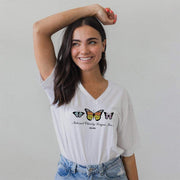 White v-neck tee, boyfriend fit featuring NCL logo and butterfly graphics. 100% Cotton. Our model is wearing size medium (unisex).