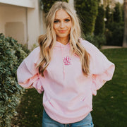 Light pink hoodie, boyfriend fit. 50% Cotton, 50% Polyester. Hot pink embroidered NCL logo. Our model is wearing size medium (unisex).