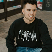 Black crewneck fleece, unisex fit. 50% Cotton, 50% Polyester. Our model is wearing size Large (unisex).