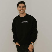 Black fleece crewneck sweatshirt with lightly distressed graphics for a vintage feel. 50% Cotton, 50% Polyester. Our model is wearing size large (unisex).